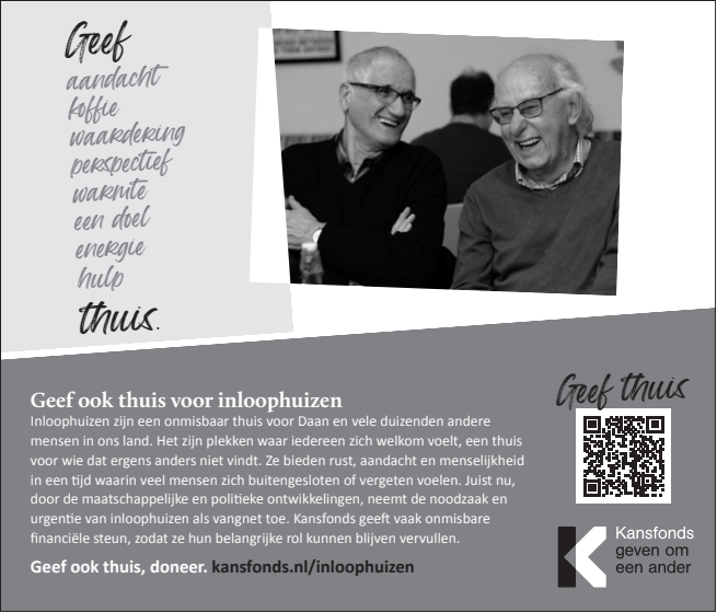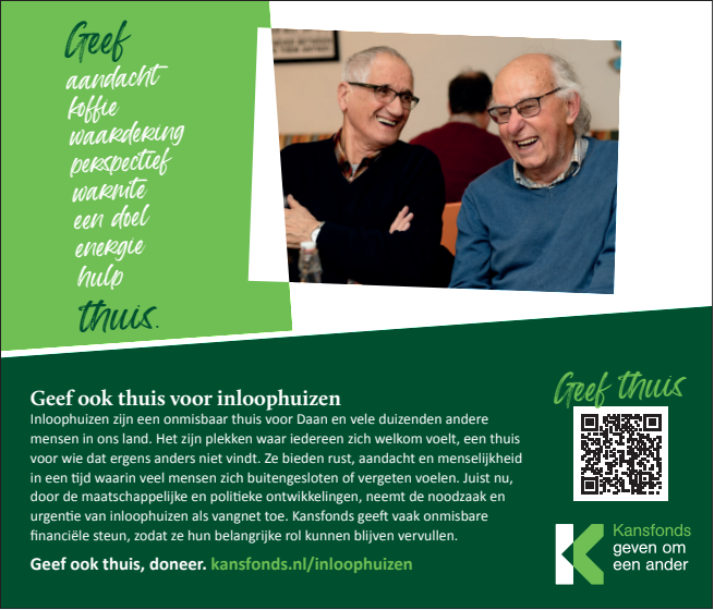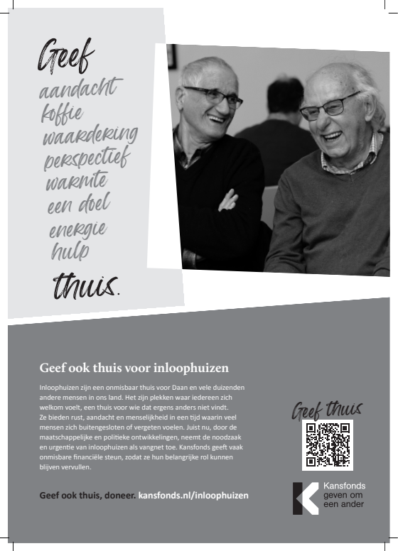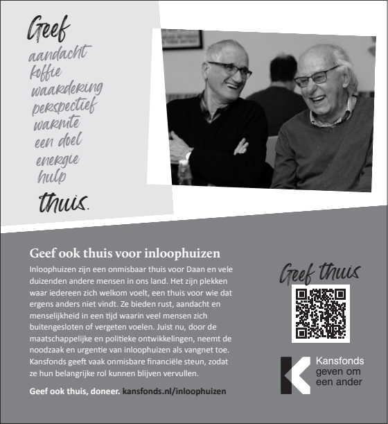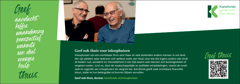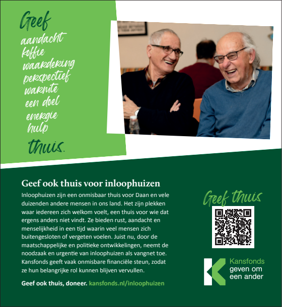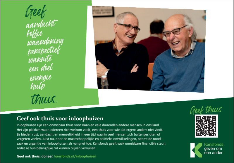 Inloophuizen bieden rust, aandacht en menselijkheid in een tijd waarin veel mensen zich buitengesloten of vergeten voelen. Juist nu, neemt de noodzaak en urgentie van inloophuizen als vangnet en thuis-voor-iedereen toe. Kansfonds geeft onmisbare financiële en organisatorische steun, èn bouwt aan structurele oplossingen om armoede & dak- en thuisloosheid uit te bannen. Dat kunnen wij alleen waarmaken dankzij donateurs en cofinanciers die onze overtuiging delen. Uw steun bij het verspreiden van onze campagne wordt dan ook zeer gewaardeerd.