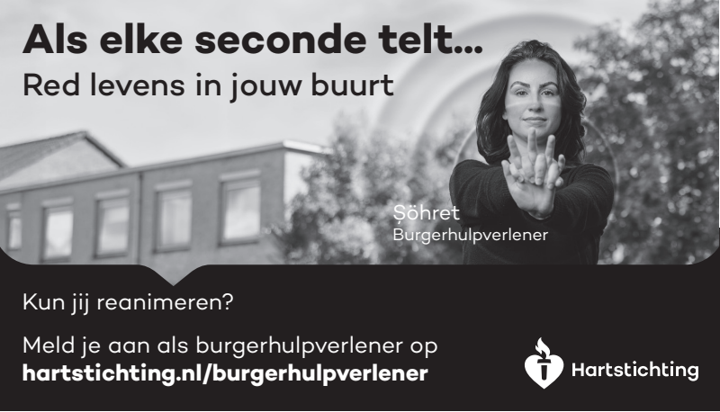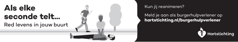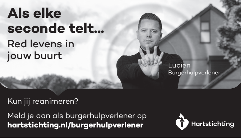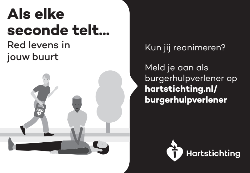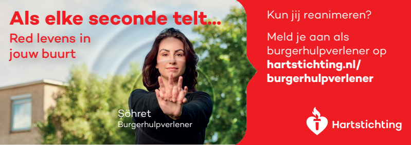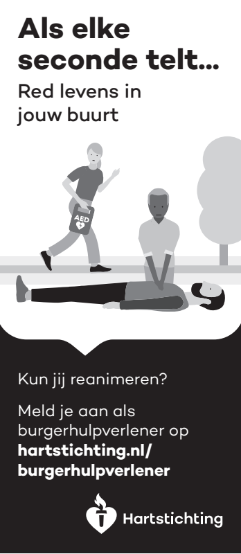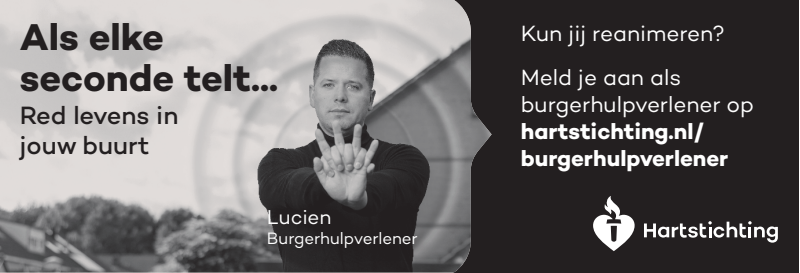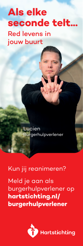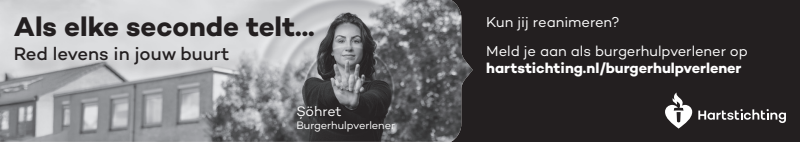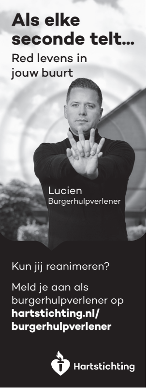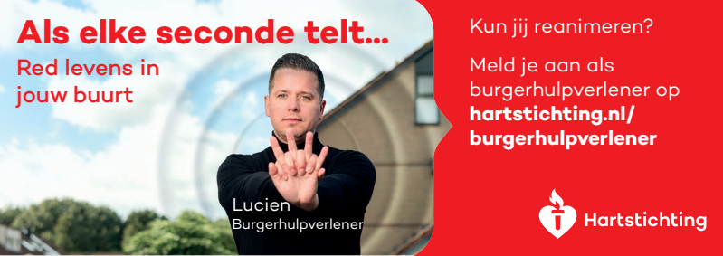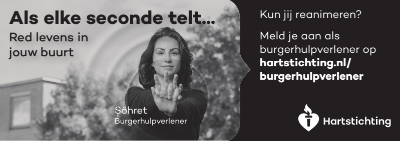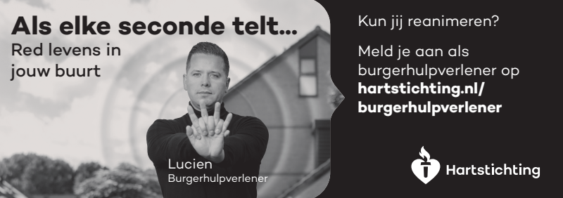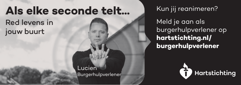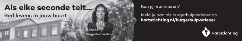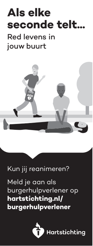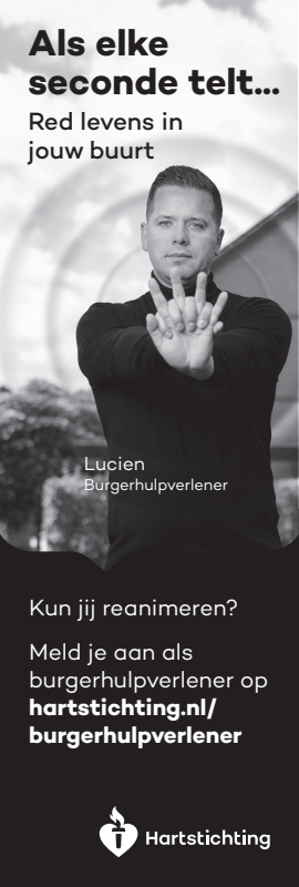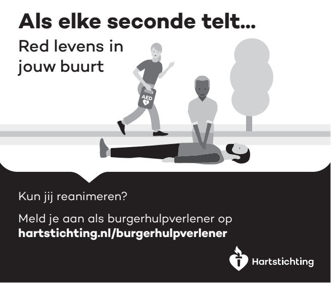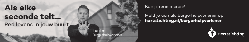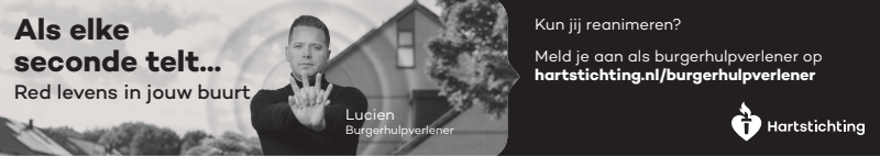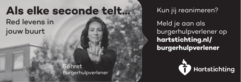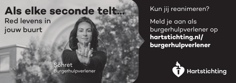 Kun jij reanimeren? Word dan burgerhulpverlener en meld je aan bij reanimatie oproepsysteem HartslagNu. Ga naar hartstichting.nl/burgerhulpverlener. Samen maken we Nederland hartveilig!