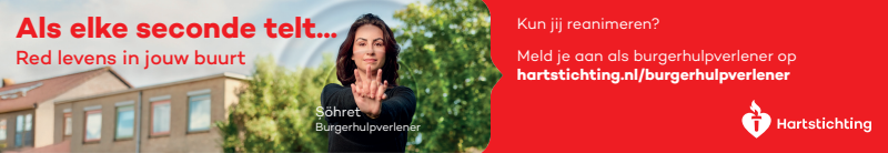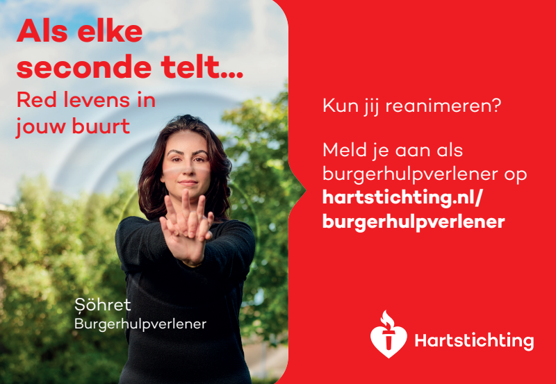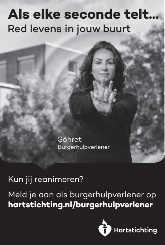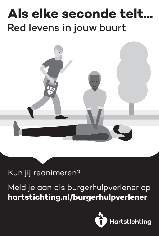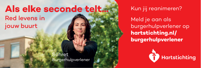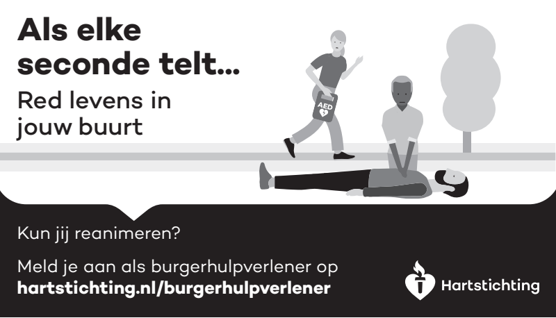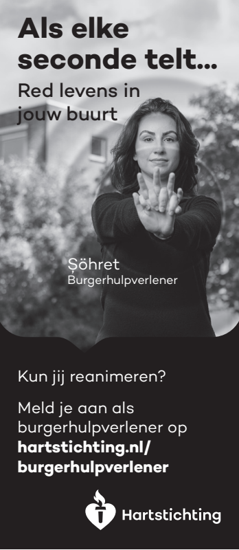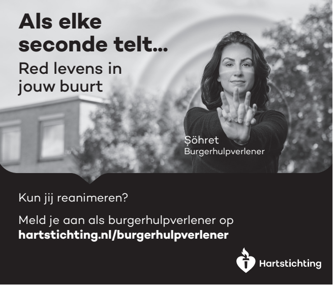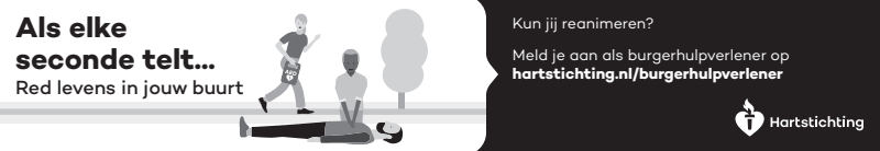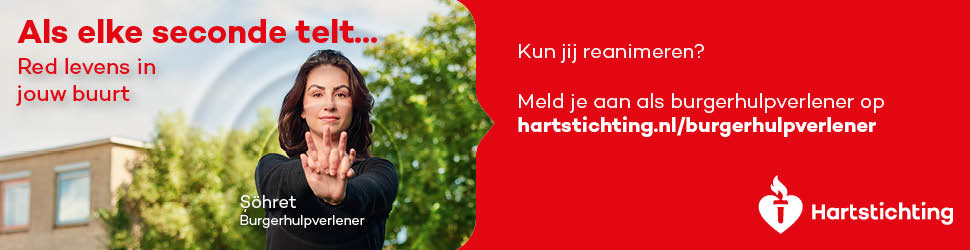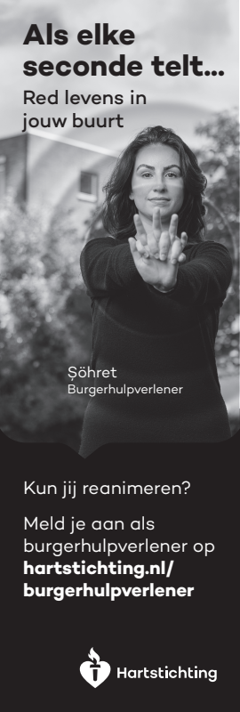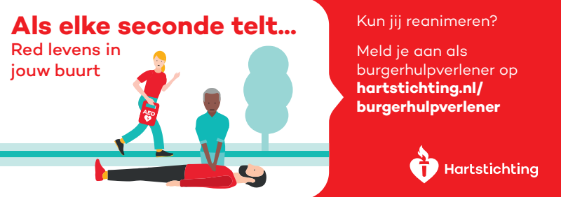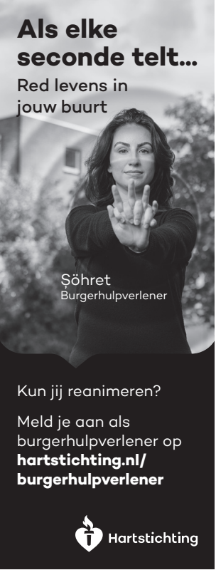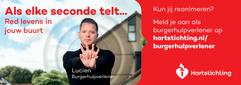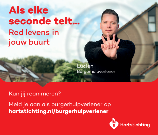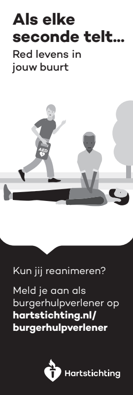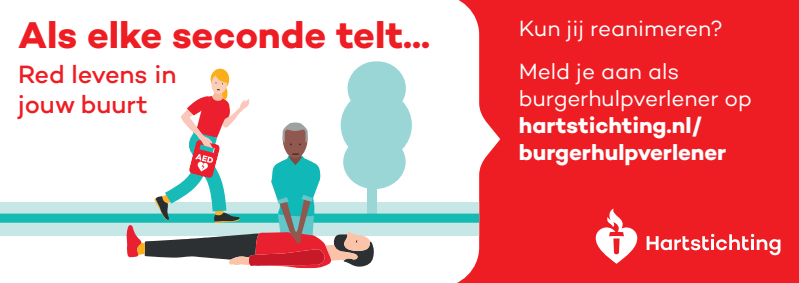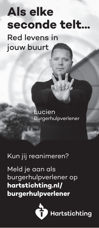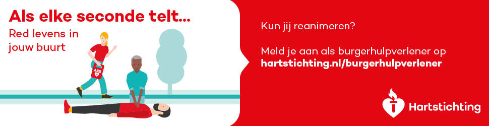 Kun jij reanimeren? Word dan burgerhulpverlener en meld je aan bij reanimatie oproepsysteem HartslagNu. Ga naar hartstichting.nl/burgerhulpverlener. Samen maken we Nederland hartveilig!