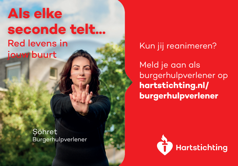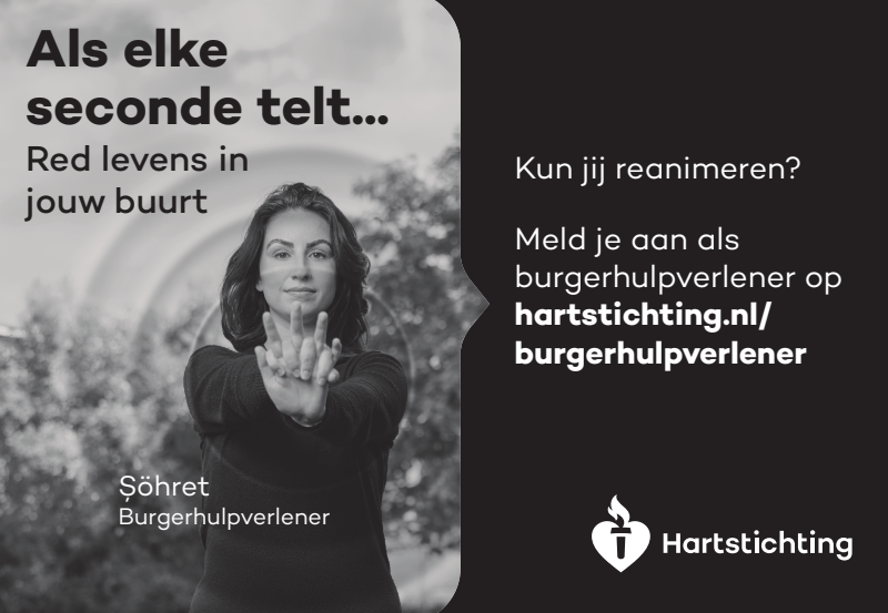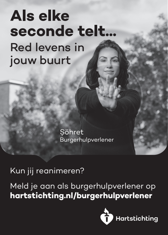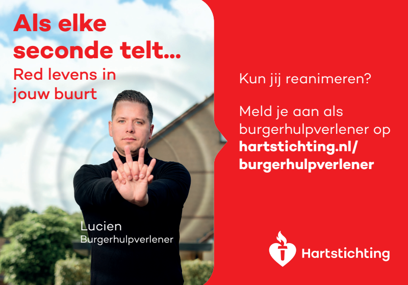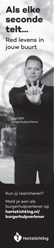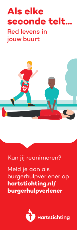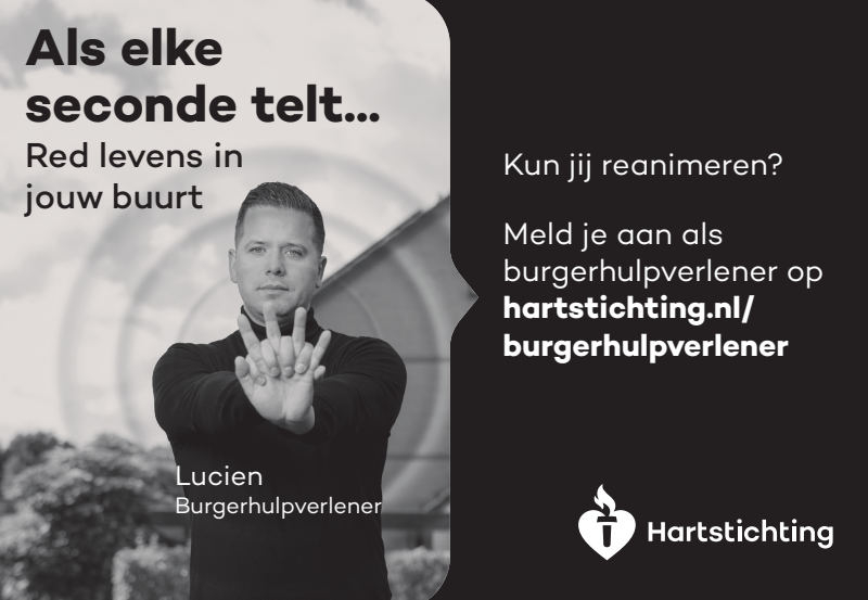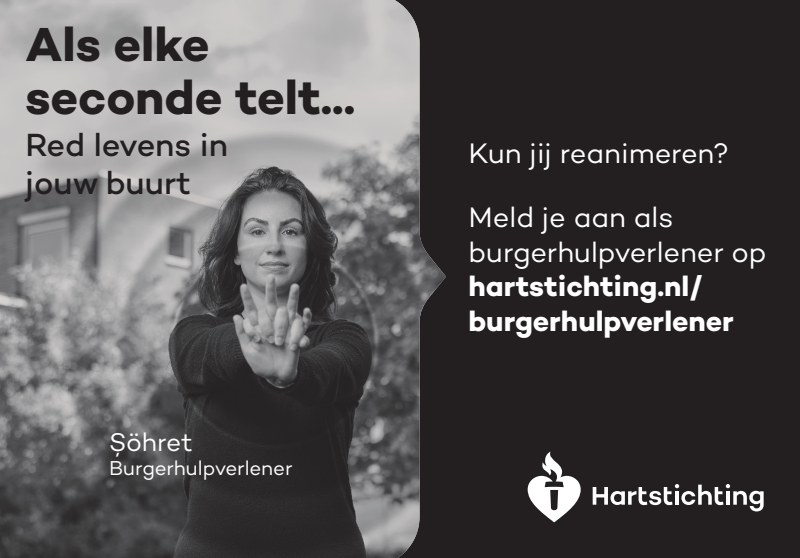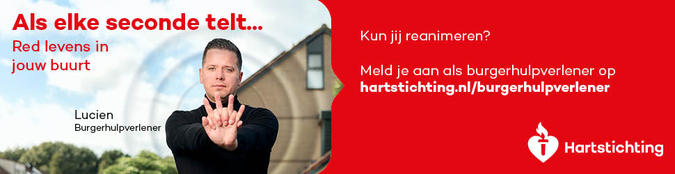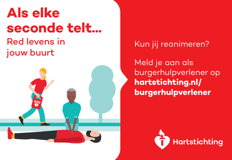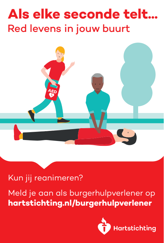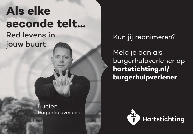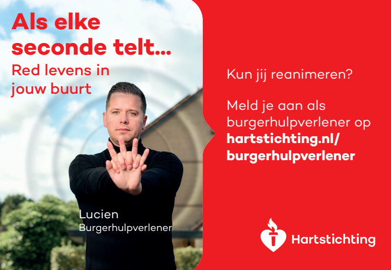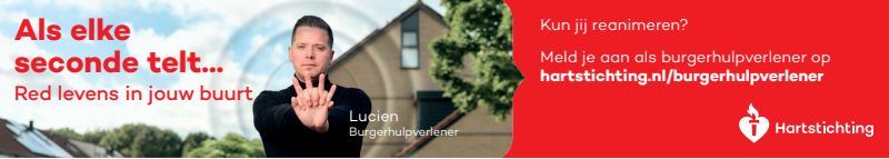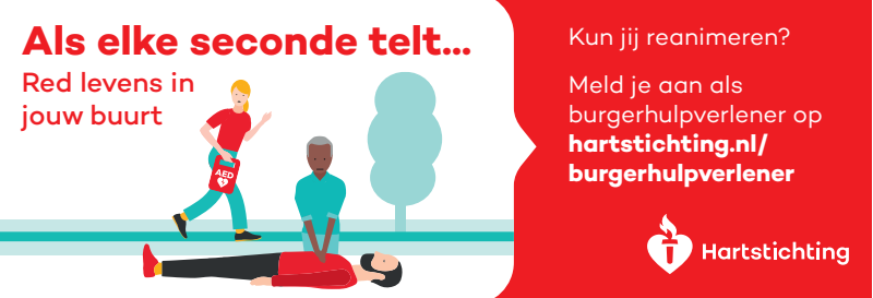 Kun jij reanimeren? Word dan burgerhulpverlener en meld je aan bij reanimatie oproepsysteem HartslagNu. Ga naar hartstichting.nl/burgerhulpverlener. Samen maken we Nederland hartveilig!