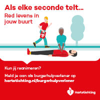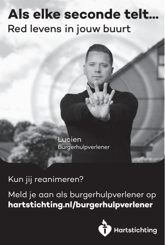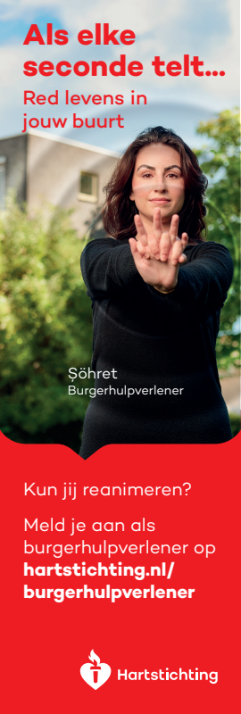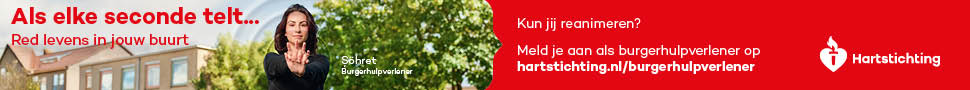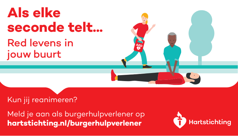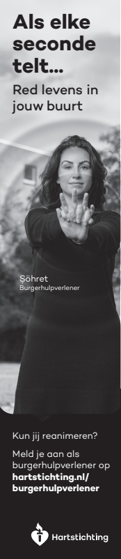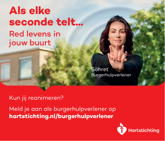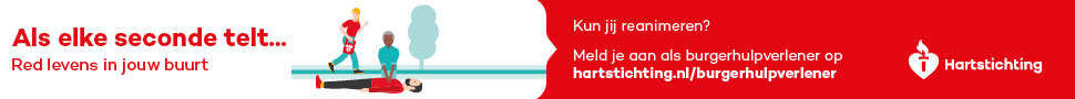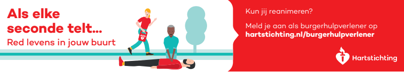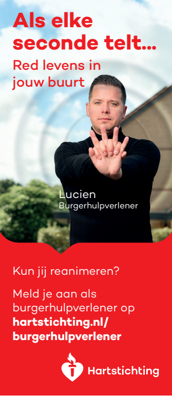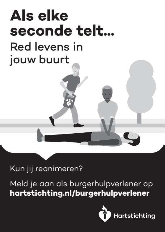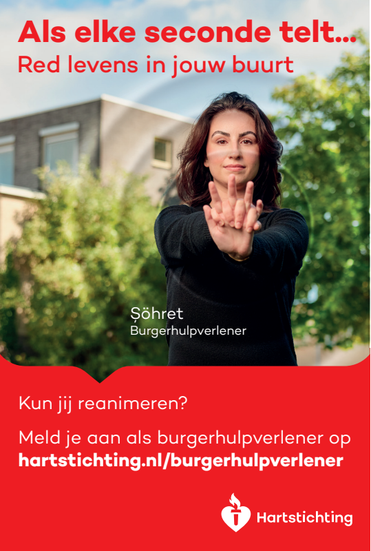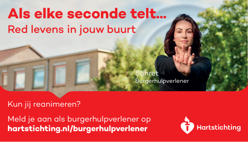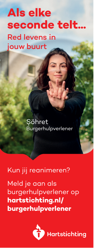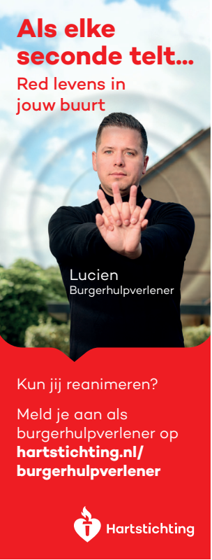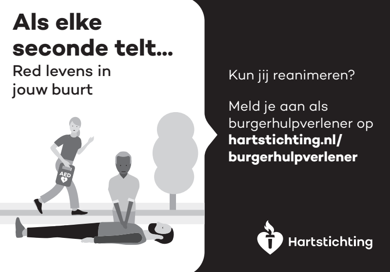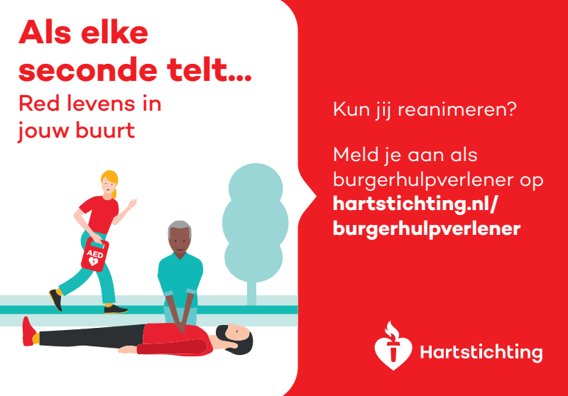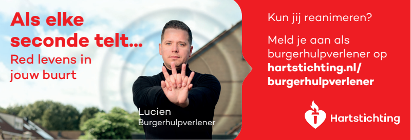 Kun jij reanimeren? Word dan burgerhulpverlener en meld je aan bij reanimatie oproepsysteem HartslagNu. Ga naar hartstichting.nl/burgerhulpverlener. Samen maken we Nederland hartveilig!