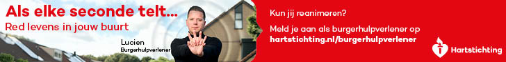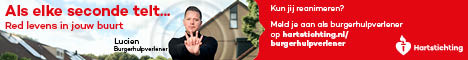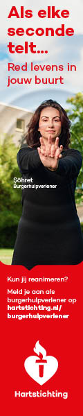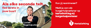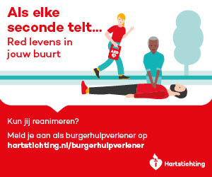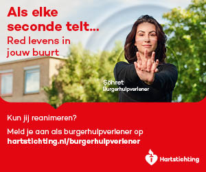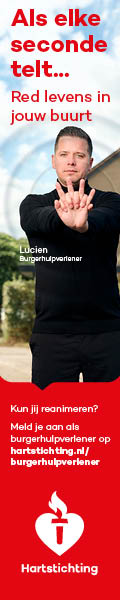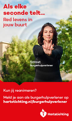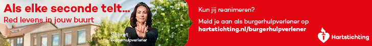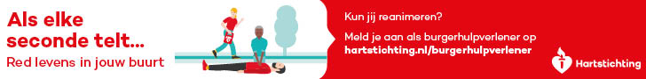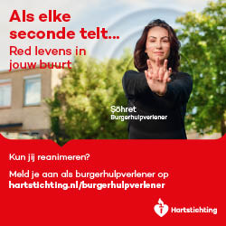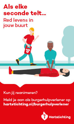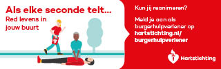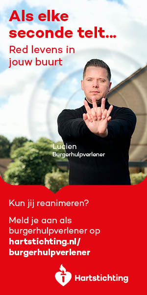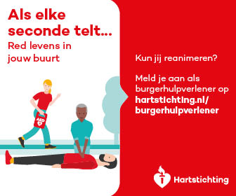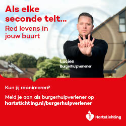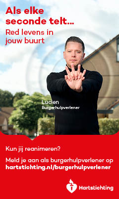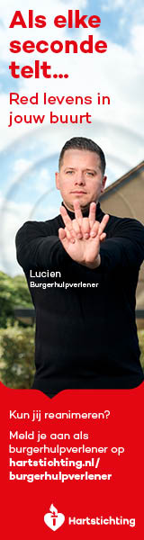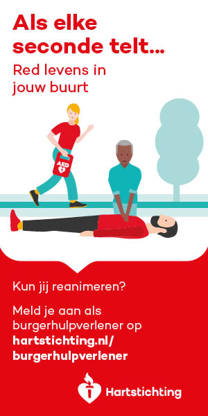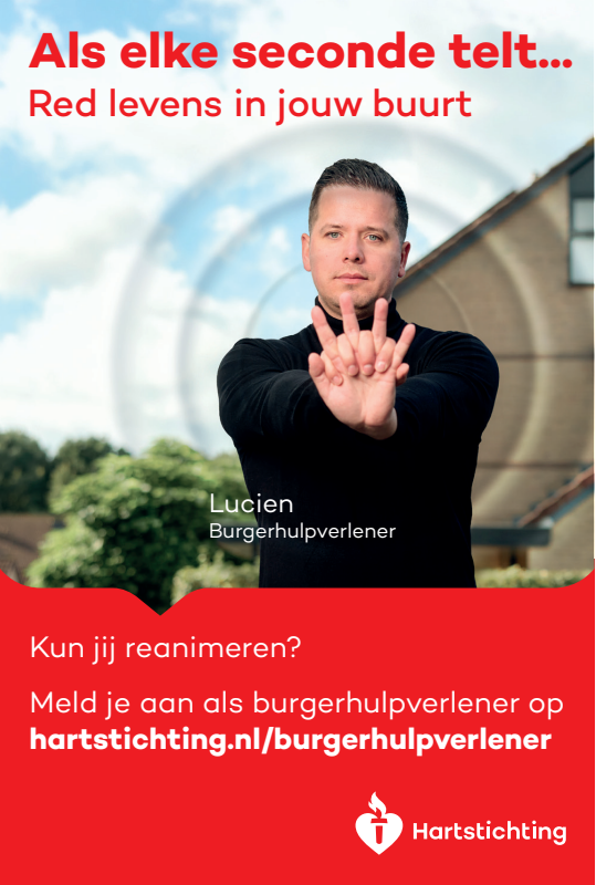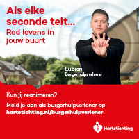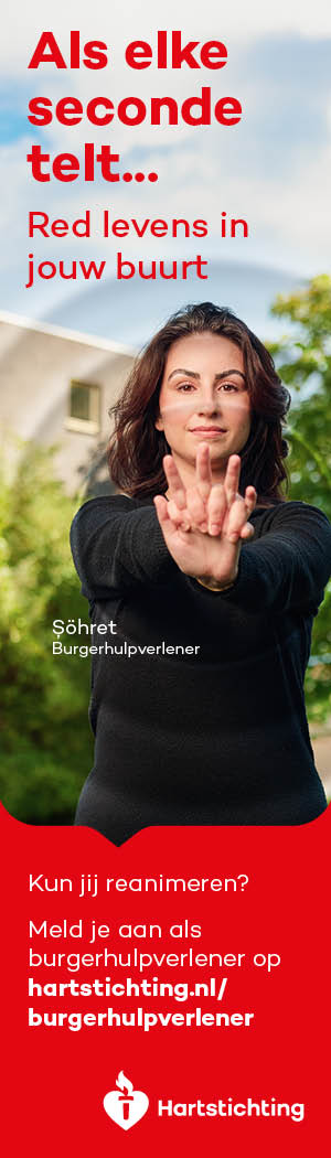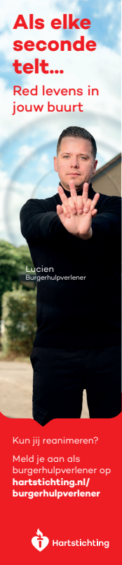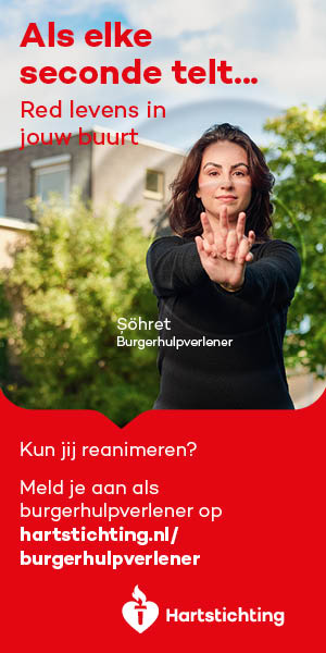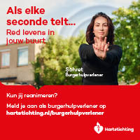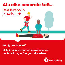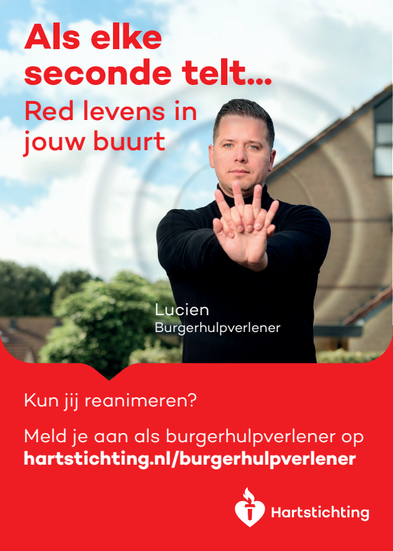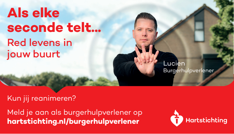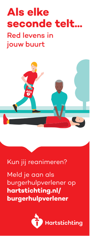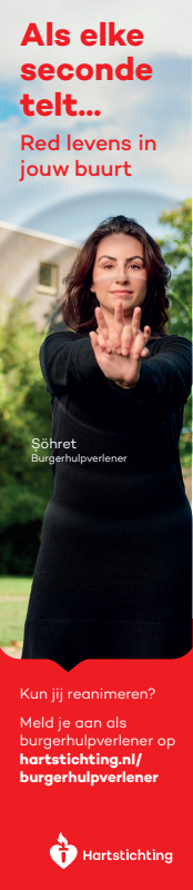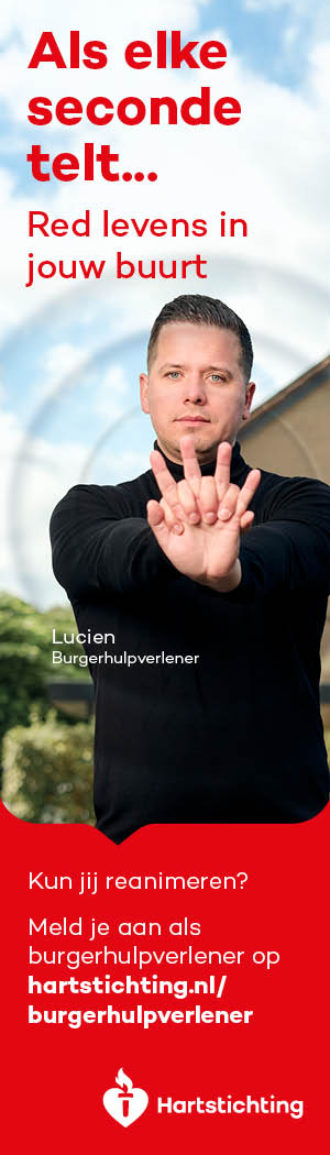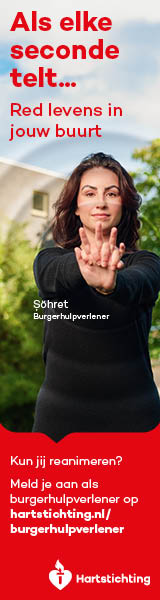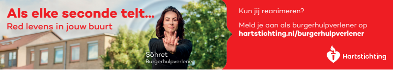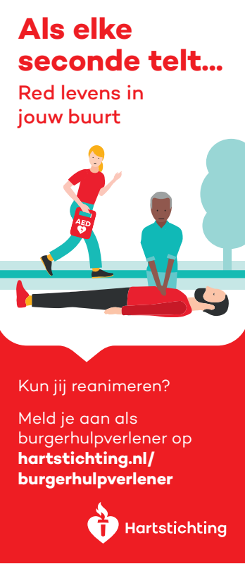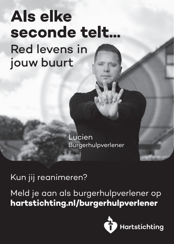 Kun jij reanimeren? Word dan burgerhulpverlener en meld je aan bij reanimatie oproepsysteem HartslagNu. Ga naar hartstichting.nl/burgerhulpverlener. Samen maken we Nederland hartveilig!