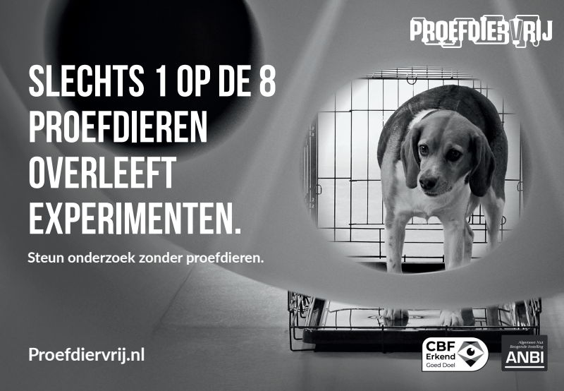 Met onze campagne “1 op de 8” confronteren we Nederland op een begrijpelijke, visuele manier met het onnodige leed in dierproeven. Zonder te choqueren, maar wel met effect. De boodschap is glashelder: dit kan én moet anders.