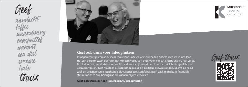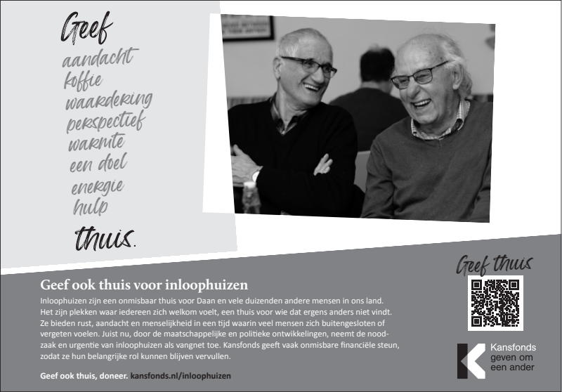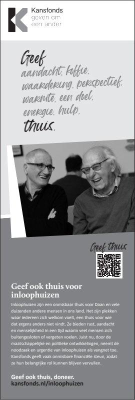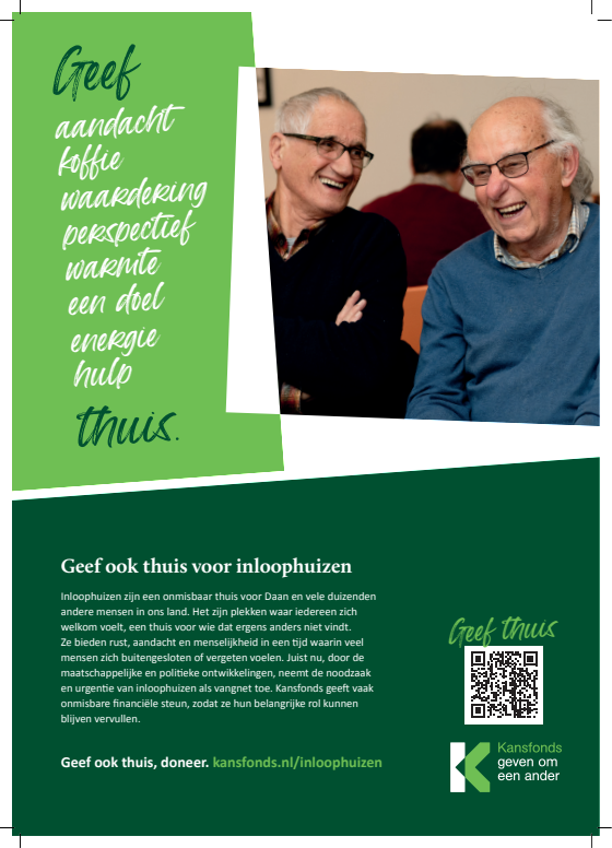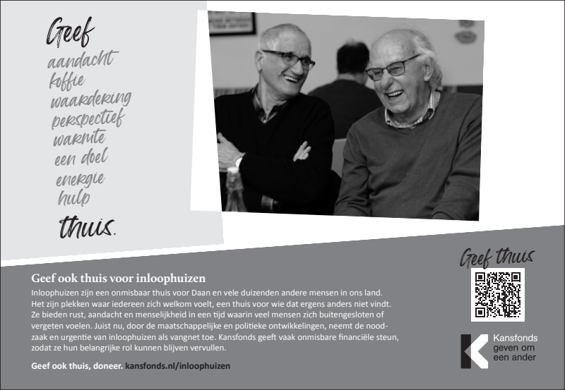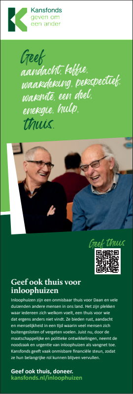 Inloophuizen bieden rust, aandacht en menselijkheid in een tijd waarin veel mensen zich buitengesloten of vergeten voelen. Juist nu, neemt de noodzaak en urgentie van inloophuizen als vangnet en thuis-voor-iedereen toe. Kansfonds geeft onmisbare financiële en organisatorische steun, èn bouwt aan structurele oplossingen om armoede & dak- en thuisloosheid uit te bannen. Dat kunnen wij alleen waarmaken dankzij donateurs en cofinanciers die onze overtuiging delen. Uw steun bij het verspreiden van onze campagne wordt dan ook zeer gewaardeerd.