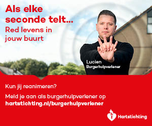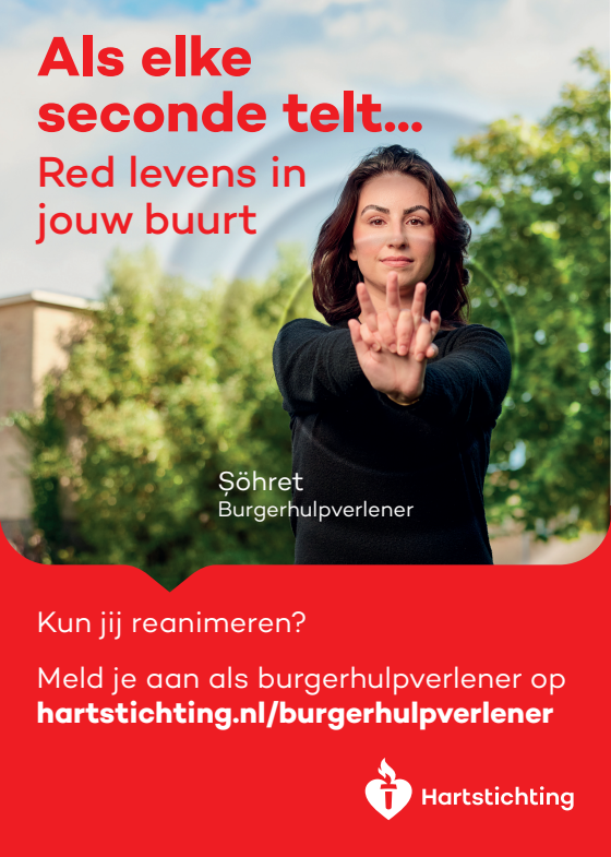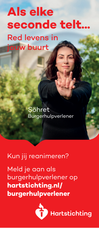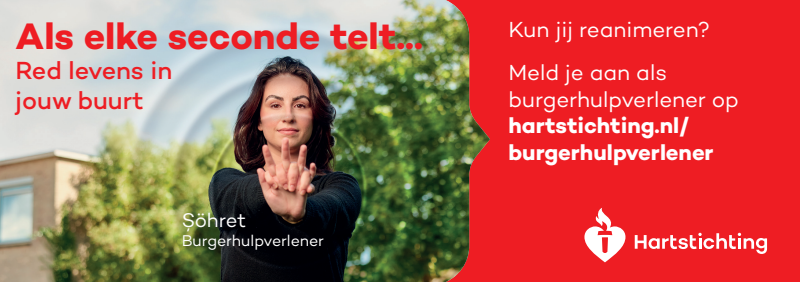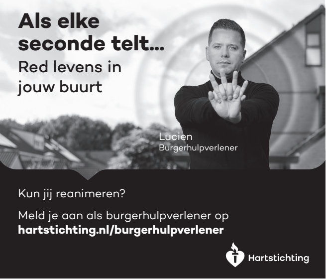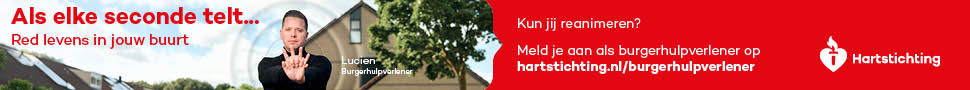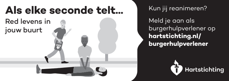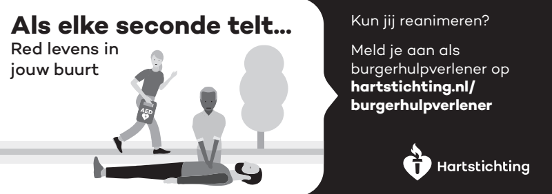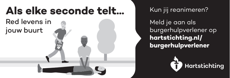 Kun jij reanimeren? Word dan burgerhulpverlener en meld je aan bij reanimatie oproepsysteem HartslagNu. Ga naar hartstichting.nl/burgerhulpverlener. Samen maken we Nederland hartveilig!